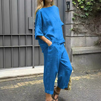 Ongeëvenaard comfort: Dankzij de luchtige pasvorm en het ademende materiaal voel je je de hele dag door op je best. De set heeft praktische zakken en half-lange mouwen, zodat je zowel stijlvol als comfortabel blijft.